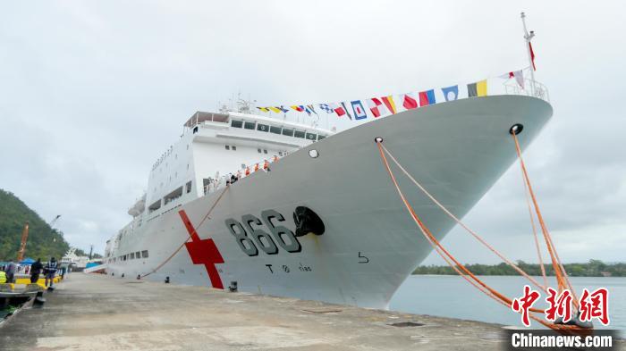中新社維拉港8月8日電 (徐巍 劉博 李珂嘉賀)當(dāng)?shù)貢r間8日上午,執(zhí)行“和諧使命—2023”任務(wù)的中國海軍“和平方舟”號醫(yī)院船抵達任務(wù)第三站瓦努阿圖維拉港,開始對瓦努阿圖進行為期7天的友好訪問并提供人道主義醫(yī)療服務(wù)。這是和平方舟第三次到訪瓦努阿圖。