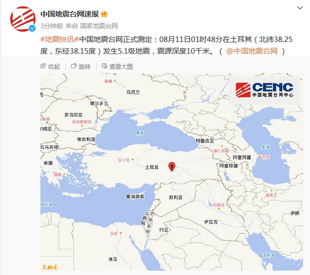 中新網(wǎng)8月11日電 據(jù)國家地震臺網(wǎng)官方微博消息,中國地震臺網(wǎng)正式測定:8月11日01時48分在土耳其(北緯38.25度,東經(jīng)38.15度)發(fā)生5.1級地震,震源深度10千米。