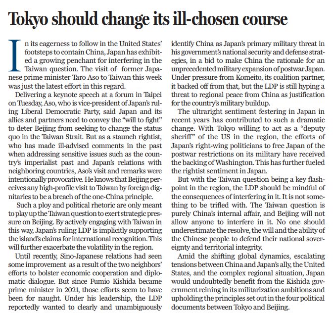 臺灣是中國領(lǐng)土不可分割的一部分,臺灣問題純屬中國內(nèi)政,不容外部勢力染指和干涉。任何人都不應(yīng)低估中國政府和人民捍衛(wèi)國家主權(quán)和領(lǐng)土完整的決心、意志和能力。日本曾長期殖民臺灣,在臺灣問題上負(fù)有不可推卸的嚴(yán)重歷史罪責(zé),理應(yīng)真心懺悔,認(rèn)真反思,謹(jǐn)言慎行。