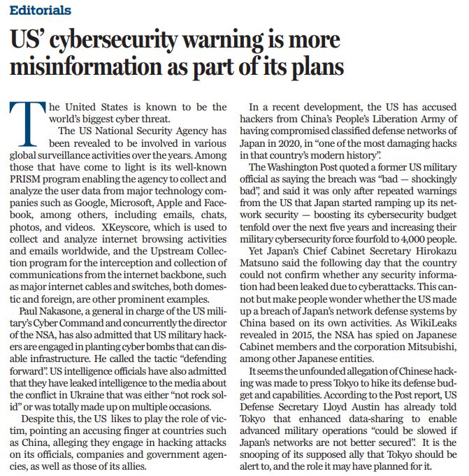 盡管如此,美國卻總是裝出一副受害者的樣子,指責(zé)中國等國對美國及其盟友的官員、企業(yè)和政府機(jī)構(gòu)發(fā)動黑客攻擊。最近,美國就指責(zé)中國黑客在2020年入侵了日本防衛(wèi)部門的機(jī)密網(wǎng)絡(luò),稱之為“日本現(xiàn)代史上最具破壞性的黑客攻擊之一”。然而,日本內(nèi)閣官房長官松野博一表示,日本無法確認(rèn)是否有任何安全信息因網(wǎng)絡(luò)攻擊而泄露。這不禁讓人懷疑,美國是否根據(jù)自己的黑客活動,編造了中國破壞日本網(wǎng)絡(luò)防御系統(tǒng)的故事?維基解密在2015年就披露,美國國家安全局在秘密監(jiān)視日本內(nèi)閣成員和三菱公司,以及其他日本實體。