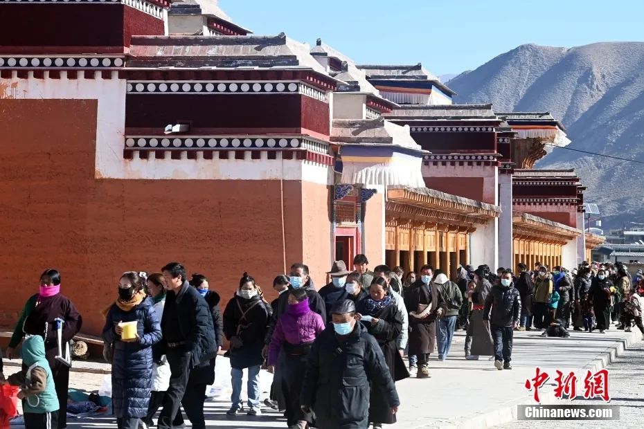2023年2月5日被譽為“世界藏學府”的拉卜楞寺迎來一年中最熱鬧的“朝佛季”,眾多藏傳佛教信眾及游客前來轉經、禮佛、朝拜。圖為信眾及游客前往朝佛途中。中新社記者 九美旦增 攝