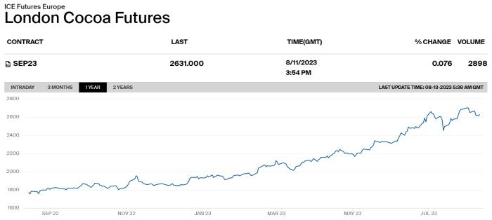 中新財經(jīng)記者在洲際交易所查詢發(fā)現(xiàn),倫敦可可期貨這波上漲,自去年底開始,8月1日一度漲至每噸2703英鎊的新高點,近日持續(xù)在高位徘徊。