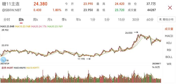 雖然近段時間食糖價格有所下降,但截至8月11日,糖11主連期貨價格仍收至每磅24.38美分。
