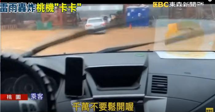 圖為臺灣桃園機場乘客涉水開車通過積水路面。圖片來源:臺灣東森新聞網(wǎng)視頻截圖