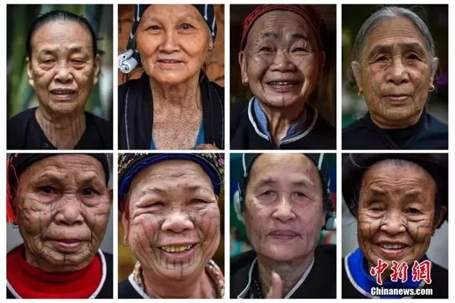 資料圖:黎族繡面文身承載著自母系氏族至今的歷史,是民族文化的“活化石”。圖為來(lái)自不同方言區(qū)的最后一代黎族繡面文身女子。駱云飛 攝