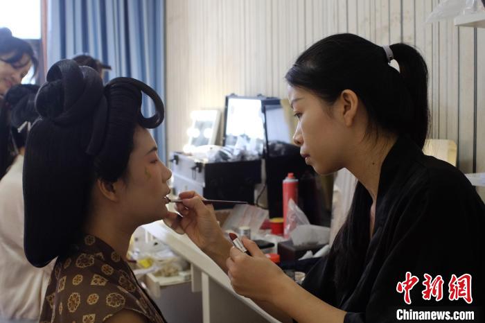 8月20日,廣西柳州,古典妝造師覃麗華正忙著給選手們化妝,完成整套造型需花費數(shù)小時。中新社記者 劉俊聰 攝