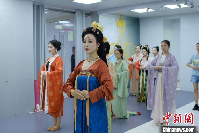 8月19日,廣西柳州,指導(dǎo)老師勞遠霞(前)帶領(lǐng)參賽選手練習(xí)古代傳統(tǒng)禮儀。中新社記者 劉俊聰 攝