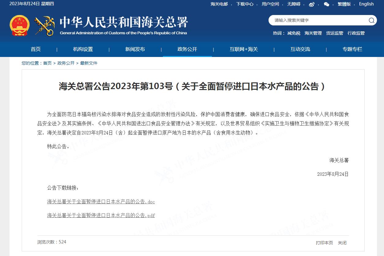 海關(guān)總署:即日起全面暫停進(jìn)口原產(chǎn)地為日本的水產(chǎn)品