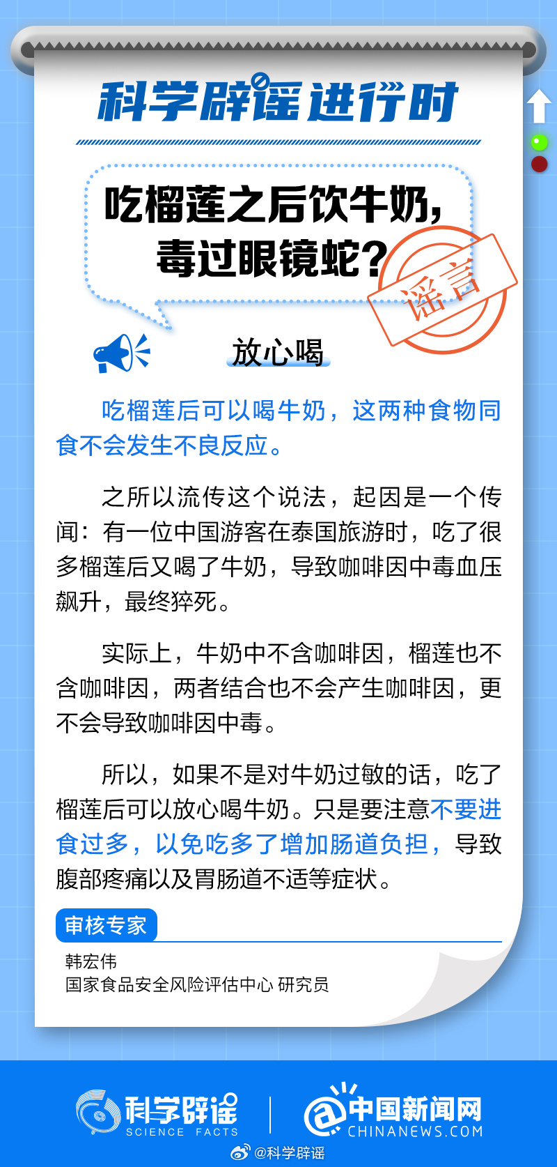 中新網(wǎng)8月24日電 吃榴蓮后可以喝牛奶,這兩種食物同食不會(huì)發(fā)生不良反應(yīng)。之所以流傳這個(gè)說(shuō)法,起因是一個(gè)傳聞:有一位中國(guó)游客在泰國(guó)旅游時(shí),吃了很多榴蓮后又喝了牛奶,導(dǎo)致咖啡因中毒血壓飆升,最終猝死。實(shí)際上,牛奶中不含咖啡因,榴蓮也不含咖啡因,兩者結(jié)合也不會(huì)產(chǎn)生咖啡因,更不會(huì)導(dǎo)致咖啡因中毒。(來(lái)源:@科學(xué)辟謠 @中國(guó)新聞網(wǎng) )