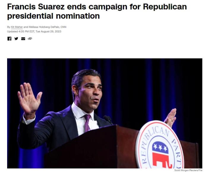 中新網(wǎng)8月30日電 綜合外媒報道,當(dāng)?shù)貢r間29日,美國邁阿密市長弗朗西斯·蘇亞雷斯(Francis Suarez)宣布暫停其2024年美國總統(tǒng)競選活動。美聯(lián)社指出,蘇亞雷斯由此成為第一位宣布退出共和黨黨內(nèi)初選的參選人。
