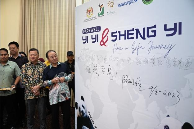 消息稱,歐陽(yáng)大使在簽名板上留言祝福兩只大熊貓“誼”路平安。范長(zhǎng)錫副部長(zhǎng)在簽名板上留言感謝“誼誼”“升誼”一路相隨在馬來(lái)西亞。