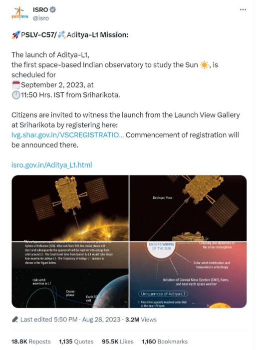 報(bào)道稱,作為印度首個(gè)專門研究太陽的任務(wù),“太陽神-L1號”(Aditya-L1)將成為印度空間研究組織新的里程碑。