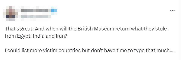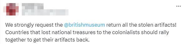不少網(wǎng)友也在社交媒體上發(fā)文,要求大英博物館采取行動(dòng)。有人表示,“大英博物館什么時(shí)候能歸還他們從埃及、印度和伊朗偷來的東西?我可以列出更多受害國(guó)家……”