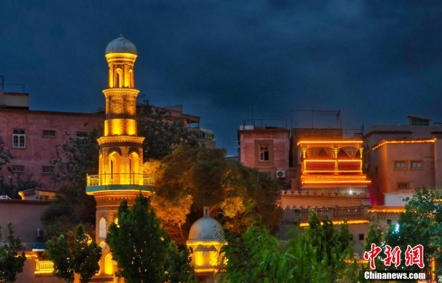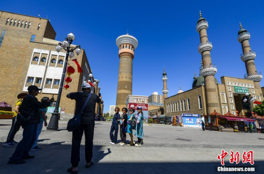 新疆國際大巴扎景區(qū),游客在地方特色建筑前參觀游覽。劉新 攝