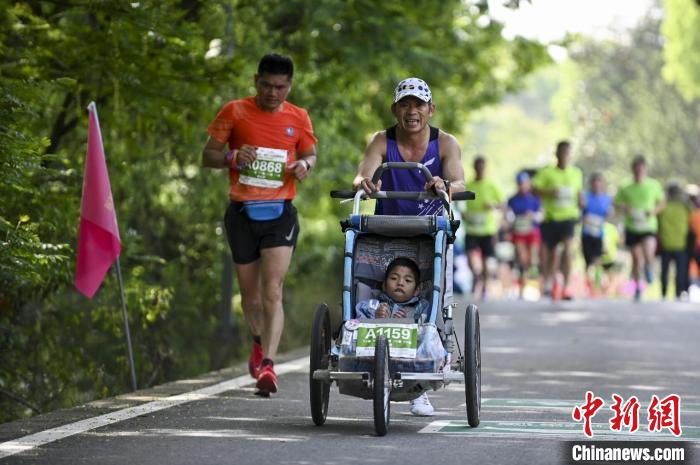 浙江金華婺城人羅書堅(右)推著兒子跑馬拉松(資料圖)。胡肖飛攝