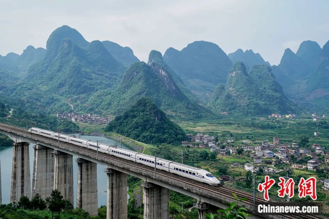 2019年5月,一列動(dòng)車穿越位于廣西陽(yáng)朔縣興坪鎮(zhèn)內(nèi)的幸福源特大橋。陳冠言 攝