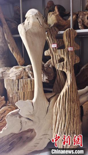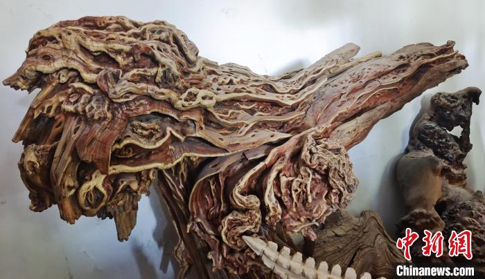 中新網(wǎng)新疆阿拉爾9月2日電(史玉江)一根腐朽的樹根,或許在別人眼里一文不值,可是在戴新看來,朽木可雕琢,那些腐朽的樹根不僅能做成工藝品,還能增收致富?!霸诎⒗瓲栠@片土地上,各種樹根和朽木段,不管是沙漠中的,還是河道里的,只要我看上,都盡可能搬回來?!毙陆a(chǎn)建設(shè)兵團第一師阿拉爾市“非遺”根雕傳承人戴新說,通過自己的雙手制作的根雕作品,讓他的生活樂趣無限。