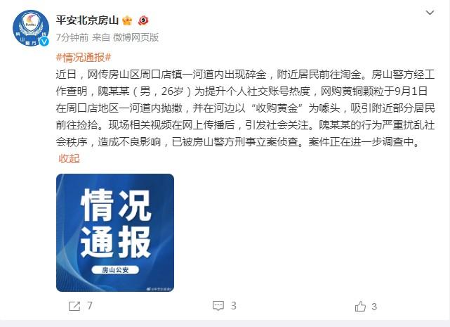 中新網(wǎng)9月3日電 3日,北京市公安局房山分局官方微博發(fā)布情況通報稱,近日,網(wǎng)傳房山區(qū)周口店鎮(zhèn)一河道內(nèi)出現(xiàn)碎金,附近居民前往淘金。房山警方經(jīng)工作查明,隗某某(男,26歲)為提升個人社交賬號熱度,網(wǎng)購黃銅顆粒于9月1日在周口店地區(qū)一河道內(nèi)拋撒,并在河邊以“收購黃金”為噱頭,吸引附近部分居民前往撿拾?,F(xiàn)場相關(guān)視頻在網(wǎng)上傳播后,引發(fā)社會關(guān)注。隗某某的行為嚴重擾亂社會秩序,造成不良影響,已被房山警方刑事立案偵查。案件正在進一步調(diào)查中。