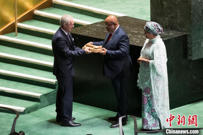 當(dāng)?shù)貢r(shí)間9月5日,第77屆聯(lián)合國(guó)大會(huì)在紐約聯(lián)合國(guó)總部閉幕。在聯(lián)合國(guó)常務(wù)副秘書長(zhǎng)阿明娜(右)的見證下,第77屆聯(lián)大主席克勒希(左一)將象征聯(lián)大主席權(quán)力的議事槌交給第78屆聯(lián)大主席弗朗西斯(中)。中新社記者 廖攀 攝