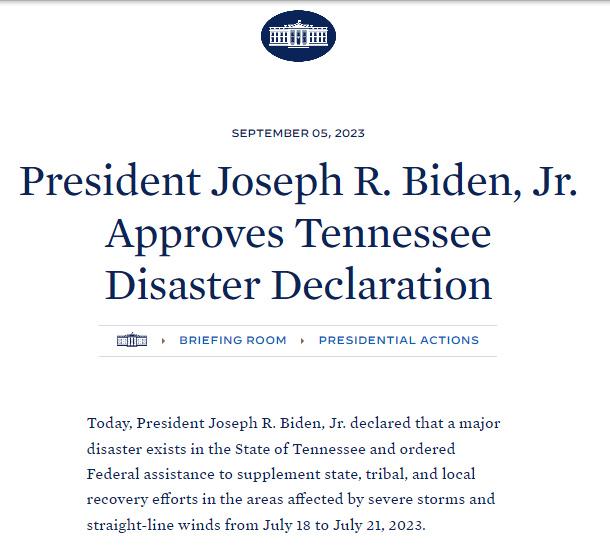 中新網(wǎng)9月6日電 據(jù)白宮官網(wǎng)消息,當(dāng)?shù)貢r(shí)間9月5日,美國(guó)總統(tǒng)拜登批準(zhǔn)田納西州重大災(zāi)難聲明,并下令為田納西州從7月18日開始至7月21日期間受風(fēng)暴影響的地區(qū)提供聯(lián)邦援助。