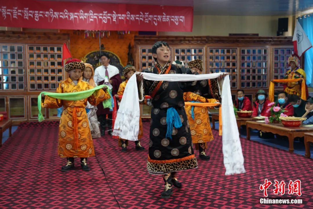 青海省雜多縣第二民族完全小學(xué)的學(xué)生表演格薩爾史詩(shī)說(shuō)唱藝術(shù)。蘇丹 攝