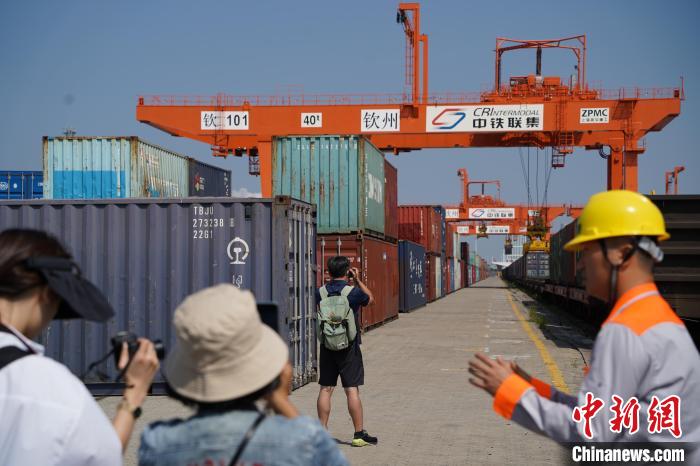 9月5日,兩岸媒體人走進位于廣西欽州的欽州鐵路集裝箱中心站?!≈行律缬浾?張楊彬 攝