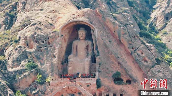 據(jù)悉,須彌山石窟始鑿于北魏孝文帝太和年間,現(xiàn)存洞窟162座,造像1000余軀,壁畫200多平方米,碑刻16方,漢藏西夏文題記53處,分布在4平方公里的五座大山崖面上。作為須彌山石窟的“名片”,第5窟唐代彌勒大佛坐像鑿于紅砂巖質(zhì)山體之上,高達20.6米,儀態(tài)威嚴、神情端莊,帛帶袈裟、面龐豐腴,造像氣勢宏偉,雕鑿技藝嫻熟。