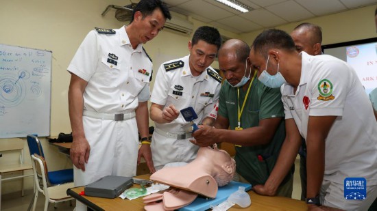 中國海軍“和平方舟”號醫(yī)院船派出醫(yī)療專家分隊赴東帝汶國立醫(yī)院進行ACLS培訓,醫(yī)院船醫(yī)療專家為當?shù)蒯t(yī)護人員進行實操講解(9月5日攝)。新華社記者 黎云 攝
