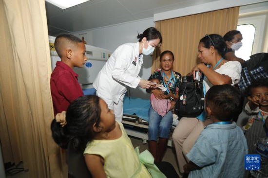 中國海軍“和平方舟”號醫(yī)院船訪問東帝汶并開展醫(yī)療服務(wù)期間,醫(yī)院船官兵為當?shù)匦袆硬槐愕幕颊叻?wù)(9月6日攝)。新華社發(fā)(桂江波 攝)