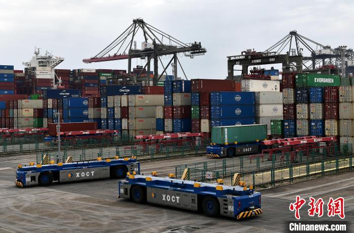 9月7日,廈門遠(yuǎn)海自動化碼頭上,轉(zhuǎn)運集裝箱的自動導(dǎo)引車正在作業(yè)。這是全球首個第四代自動化碼頭、中國首個擁有全部自主知識產(chǎn)權(quán)的自動化碼頭,開行了多條“絲路海運”命名航線?!≈行律缬浾?張斌 攝