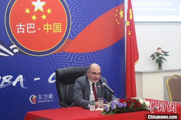 古巴駐華大使白詩德在古巴駐華大使館13日舉行的媒體見面會上發(fā)言?!√K婧欣 攝