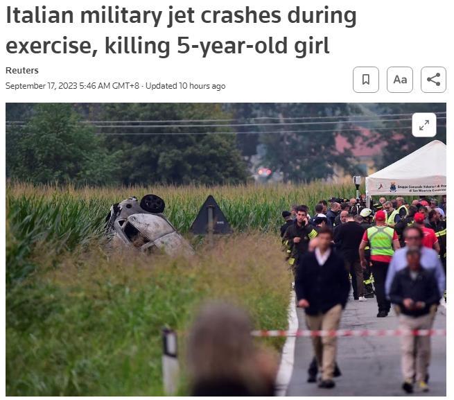 中新網(wǎng)9月17日電 綜合外媒報道,當?shù)貢r間16日,意大利空軍“三色箭”飛行表演隊的一架飛機在都靈郊外訓練時墜毀,導致地面一名5歲女童身亡,飛行員在墜毀前彈射逃生。