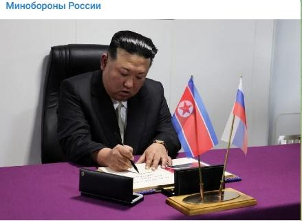 當(dāng)?shù)貢r(shí)間16日,金正恩在俄“沙波什尼科夫元帥”號(hào)護(hù)衛(wèi)艦貴賓簿上留言。圖片來(lái)源:俄國(guó)防部社交媒體截圖
