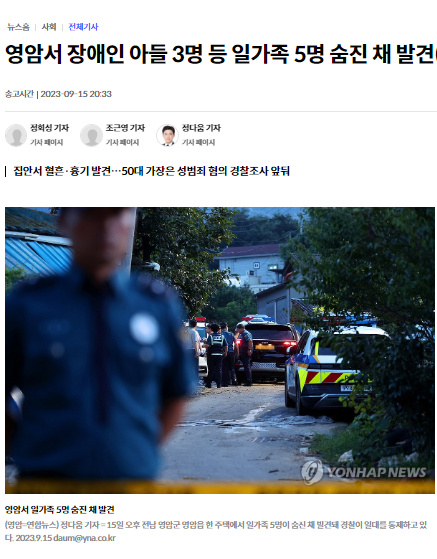 據(jù)報(bào)道,15日下午3時(shí)54分,韓國警察廳接到了關(guān)于全羅南道靈巖郡金某住宅窗戶上有血跡的報(bào)警。當(dāng)?shù)鼐脚c消防急救隊(duì)一同前往,進(jìn)入該住宅后發(fā)現(xiàn)了金某、金某妻子以及金某夫婦的三名20多歲兒子的尸體。