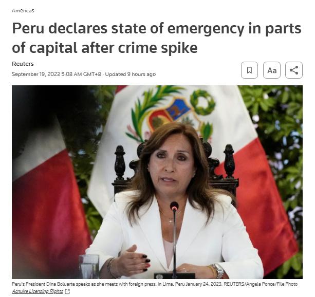 中新網(wǎng)9月19日電 據(jù)路透社報(bào)道,當(dāng)?shù)貢r(shí)間18日,秘魯總統(tǒng)博盧阿特表示,秘魯政府已宣布首都利馬市三個(gè)犯罪率飆升的地區(qū)進(jìn)入緊急狀態(tài),這一措施允許軍方協(xié)助政府加強(qiáng)地區(qū)安全管控。
