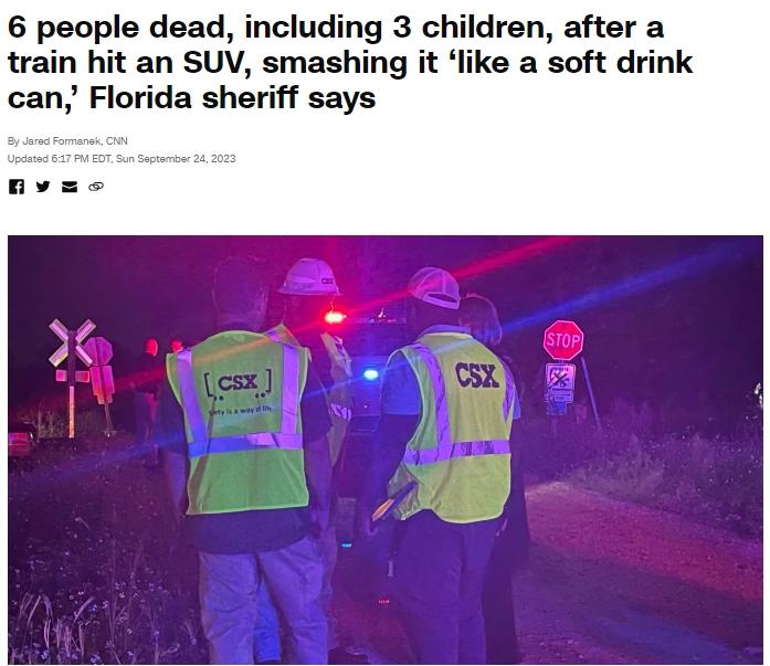 中新網(wǎng)9月25日電 據(jù)美國有線電視新聞網(wǎng)(CNN)24日報(bào)道,當(dāng)?shù)貢r(shí)間23日晚,美國佛羅里達(dá)州希爾斯伯勒縣一列火車在經(jīng)過鐵路口時(shí)與一輛SUV汽車相撞,造成6人遇難,其中包括3名兒童。