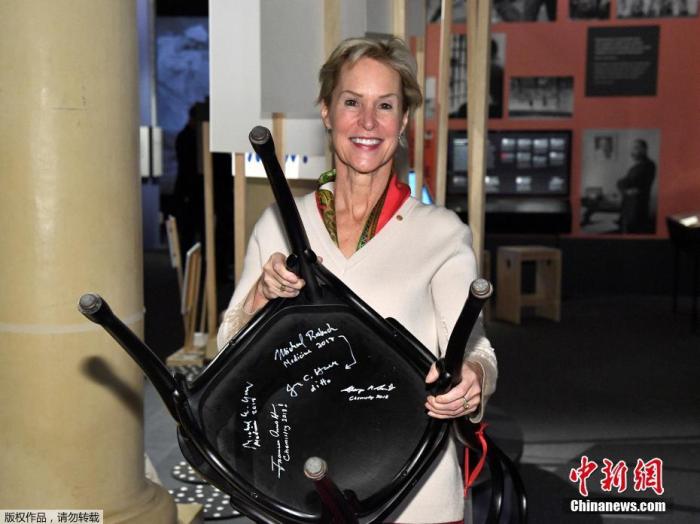資料圖:2018年諾貝爾化學獎得主弗朗西斯·阿諾德展示其簽名的椅子。