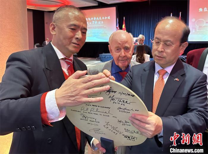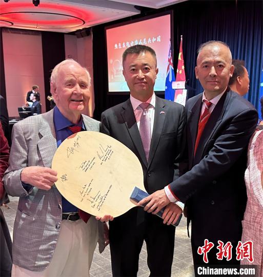 9月28日,中國(guó)駐澳大利亞使館與駐悉尼總領(lǐng)館在悉尼聯(lián)合舉辦國(guó)慶招待會(huì),隆重慶祝中華人民共和國(guó)成立74周年。圖為中國(guó)駐澳大利亞大使肖千(右)在澳大利亞乒乓老將諾爾(中)的乒乓球板上簽字留念。中新社記者 顧時(shí)宏 攝
