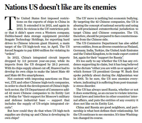 美國的這一做法,是徹頭徹尾的“經(jīng)濟(jì)霸凌”。本次將42家中國企業(yè)列入“管制清單”,正是美國泛化其所謂“國家安全”概念,動用其所謂“治外法權(quán)”,打壓中國及中國企業(yè)的又一實例。這可能會引來中國的反制措施,對此美國應(yīng)做好準(zhǔn)備。