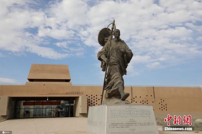 資料圖:位于新疆維吾爾自治區(qū)的高昌故城前,現(xiàn)陳列有唐代高僧玄奘的塑像,玄奘西行求法時曾途經(jīng)此地。