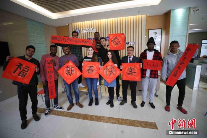 資料圖:2019年2月3日是中國農(nóng)歷臘月二十九,“春節(jié)”將至,來自巴基斯坦、烏茲別克斯坦、烏克蘭等國家和地區(qū)的十余名中國石油大學(xué)的留學(xué)生在青島歡聚一堂,一起寫“春聯(lián)”、題“?!弊帧①N“窗花”,感受中華文化。中新社記者 胡耀杰 攝