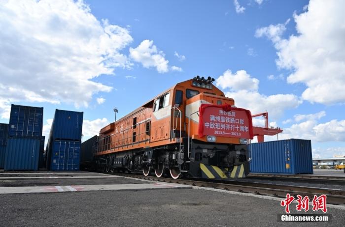 資料圖:2023年9月20日,在內(nèi)蒙古滿洲里站集裝箱場,X8102次回程中歐班列,編組53輛,載滿板材、汽車配件、食品等貨品,開往西安國際港。