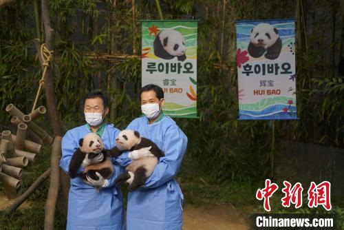 10月12日,韓國愛寶樂園內,工作人員抱著大熊貓雙胞胎幼崽“睿寶”(左)與“輝寶”亮相?!≈行律缬浾?劉旭 攝