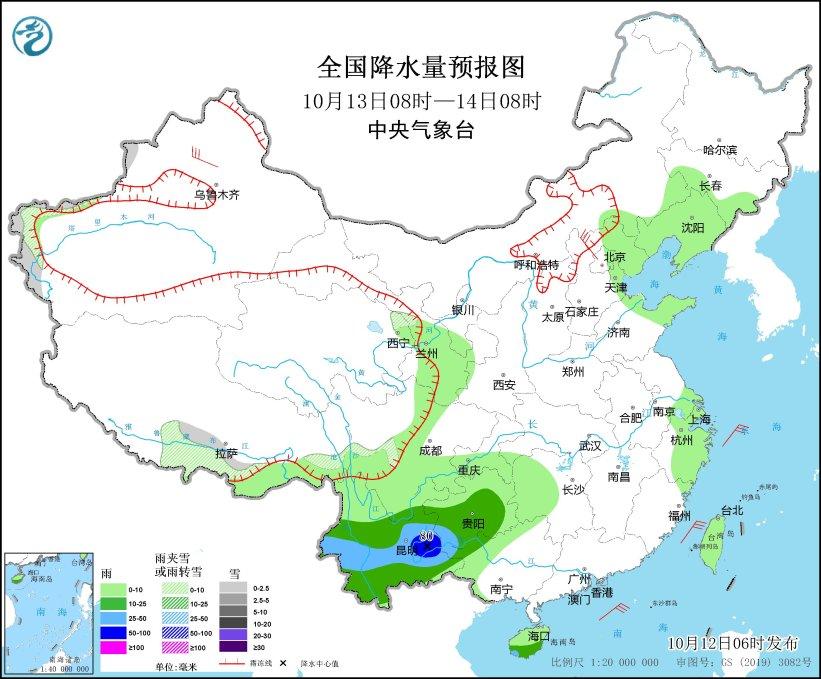 10月13日08時(shí)至14日08時(shí),新疆西部、西藏南部等地部分地區(qū)有小雪或雨夾雪;四川南部、貴州中南部、云南大部等地部分地區(qū)有中到大雨,其中,云南東部局地有暴雨(50~80毫米)。新疆西北部、河北北部等地部分地區(qū)有5~6級風(fēng);臺灣海峽、巴士海峽、南海北部海域、北部灣等海域有5~7級風(fēng)、陣風(fēng)8級。(見圖2)。