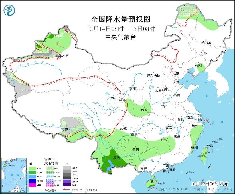 10月14日08時(shí)至15日08時(shí),內(nèi)蒙古東北部、新疆西部、西藏南部等地部分地區(qū)有小到中雪或雨夾雪;黑龍江西北部、遼寧東部、陜西南部、甘肅東南部、四川南部、貴州大部、云南、廣西西部、湖南中南部、江西西南部、浙江中東部、福建東部、海南島及臺灣島等地部分地區(qū)有小到中雨,其中,云南南部局地有大雨。內(nèi)蒙古東北部、新疆西北部、河北北部等地部分地區(qū)有5~6級風(fēng);渤海、渤海海峽等海域有6~7級風(fēng)、陣風(fēng)8~9級。(見圖3)。