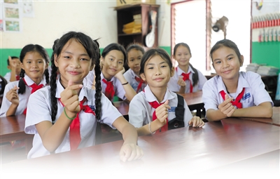 在老撾占塔布里縣中老友好農(nóng)冰村小學(xué)的教室里,學(xué)生們用手比心,表達(dá)對(duì)中國(guó)的感謝。
