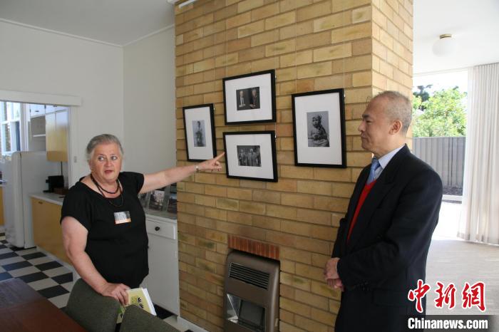 10月14日,惠特拉姆故居管理人員(左)向參訪者介紹惠特拉姆生前訪問中國的相關(guān)照片。中新社記者 顧時宏 攝