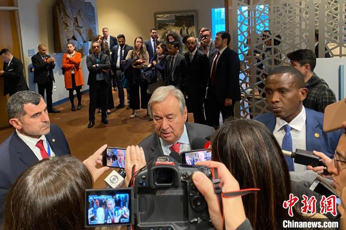 當?shù)貢r間10月13日,聯(lián)合國秘書長古特雷斯在安理會就中東局勢進行緊急磋商后,在紐約聯(lián)合國總部回答記者提問?!≈行律缬浾?王帆 攝