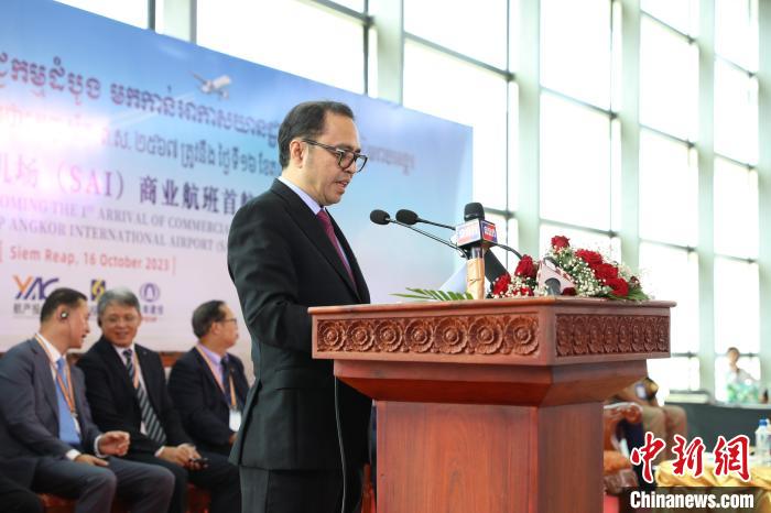 10月16日,柬埔寨暹粒吳哥國際機場通航運營。圖為柬埔寨副首相兼內閣辦公廳大臣翁賽維索在首航儀式上致辭 (黎海月 攝)