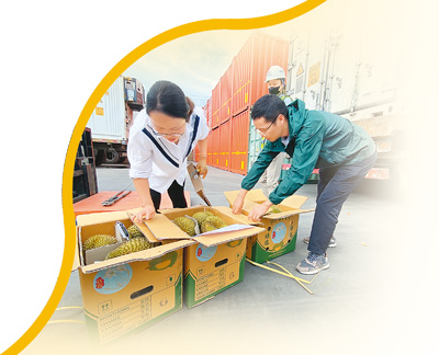 核查貨證、抽樣開箱、剖果檢查……黃中磊和同事劉奇開始按流程查驗?!皺z查病媒及有害生物,未見異常;檢查包裝,未見異常;核對品名,未見異常;檢查標簽標識,未見異常……”經(jīng)過認真查驗,兩人確認這批榴蓮查驗合格,可以出證放行。